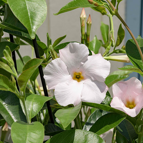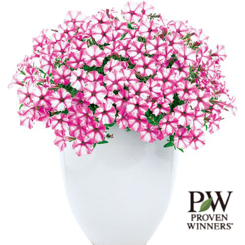 白地にピンクストライプ。さわやかな色合いの花が株いっぱいに咲き、草姿はこんもりとまとまる。暑さや蒸れに強く、雨後も傷みにくい品種。次々と自然に分枝するので摘芯の必要がなく、また夏後の植え替えも不要。ナス科