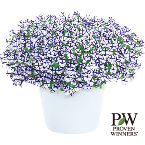 白地にブルーストライプ。さわやかな色合いの花が株いっぱいに咲き、草姿はこんもりとまとまる。暑さや蒸れに強く、雨後も傷みにくい品種。次々と自然に分枝するので摘芯の必要がなく、また夏後の植え替えも不要。ナス科