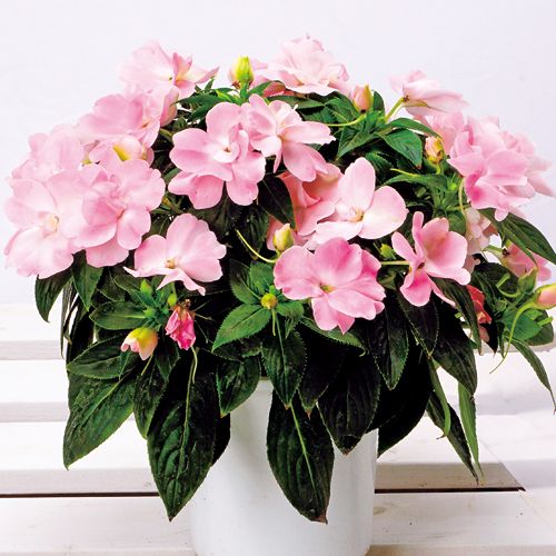 鮮明桃色花。花弁が幾重にも重なり、バラのように咲き誇る姿が非常に美しい。草姿はこんもりとまとまる。べと病耐性を備え、枯れづらい性質にパワーアップ。ツリフネソウ科