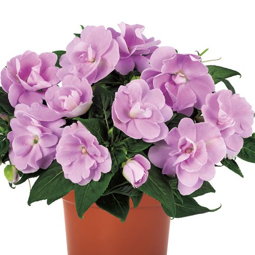 ラベンダー色花。ユニークな八重咲きのニューギニアインパチェンス。株張りがよく、育てやすい。ツリフネソウ科。
