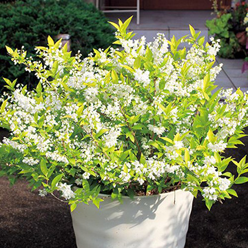白花から咲き進むと桃色に変化。晩春に枝を覆うほど咲き誇り、夏以降も返り咲きして長期間楽しめる。従来品種に比べコンパクトな樹形の矮性種で花壇や鉢植えにおすすめ。スイカズラ科