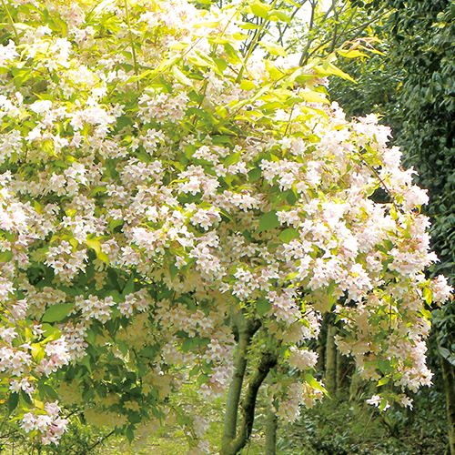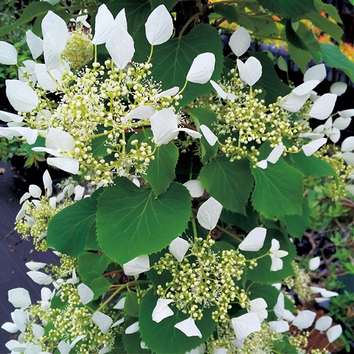 ノリウツギの中で最も早く開花するといわれ、ガクアジサイのような咲き方をする多花性種。白から、徐々にピンクに色づく花が魅力的。鉢植えや狭い場所での植栽におすすめ。アジサイ科