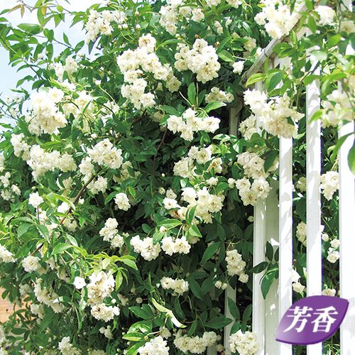 さわやかな芳香を楽しめる白花八重。育てやすく丈夫な花木で、つるは細くしなやかで、トゲが少なく、他のバラに先駆けて径2cmの八重小花を株いっぱいに咲かせる。バラ科