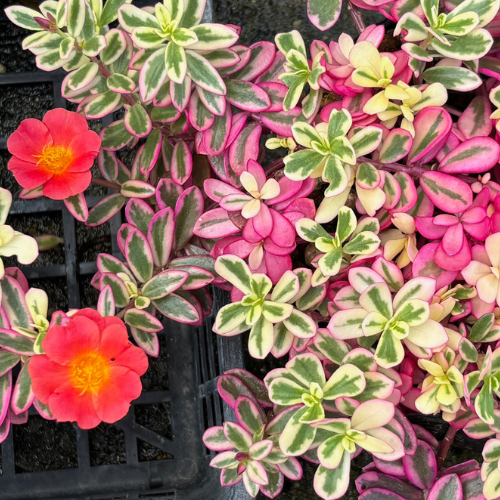 日照や肥料によって葉や花の色が変化する斑入りのポーチュラカ。夏の暑さや乾燥に強く、真夏も休まずに咲き続ける。枝は地を這うように伸びる。スベリヒユ科