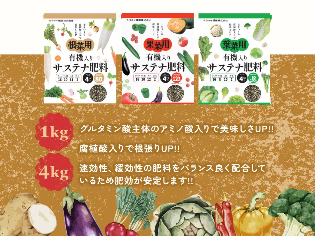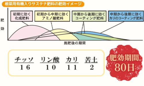栽培期間が3~4カ月程度の作物に最適な根菜のサステナ肥料です。※豆類にもご使用いただけます。