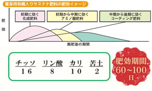 栽培期間が2~3ヶ月程度の作物に最適な葉菜のサステナ肥料です。