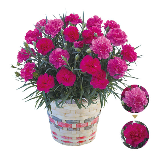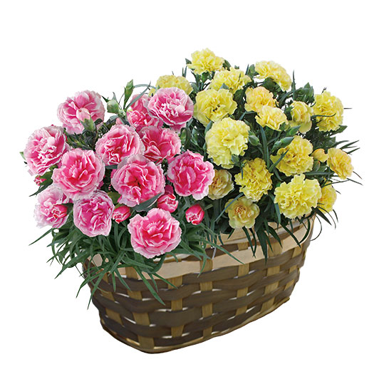 春らしくかわいらしい色の組み合わせが楽しめるカーネーションの寄せかご。お届け内容