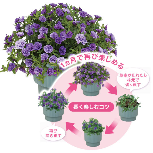 涼しげなブルーの花がこんもりと咲き続ける。切り戻すと再び咲くので長く楽しめる!お届け内容