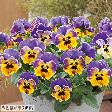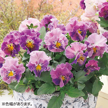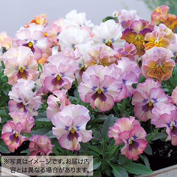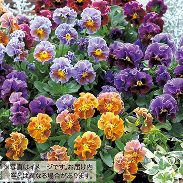 パンジーの中でも珍しい八重咲き花をミックス。波打ち重なる花弁はひときわ華やかで、庭の表情もより豊かになり楽しめる。