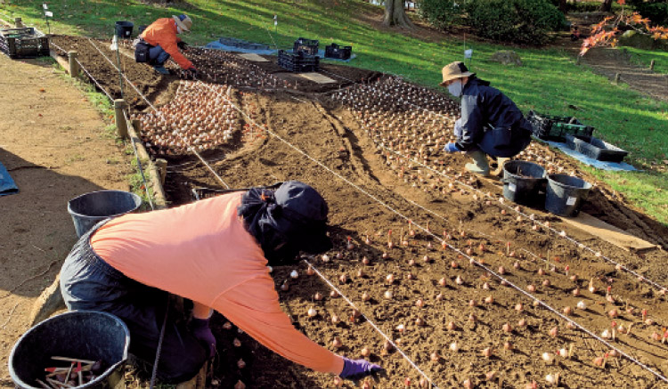 デザイン通りに、球根の向きを揃えて植え付けていく。25万球にも及ぶので、適期の期間内に終えるには時間との戦い!