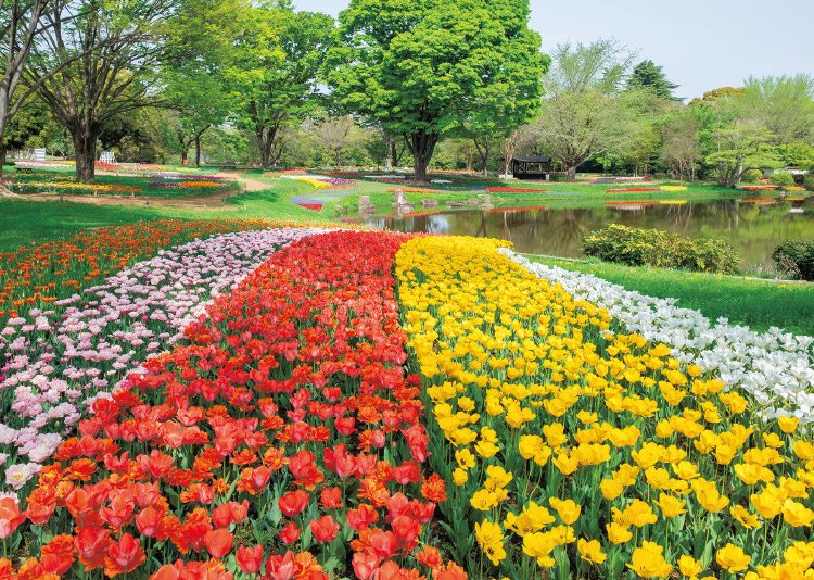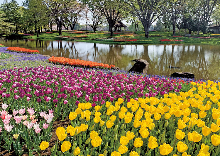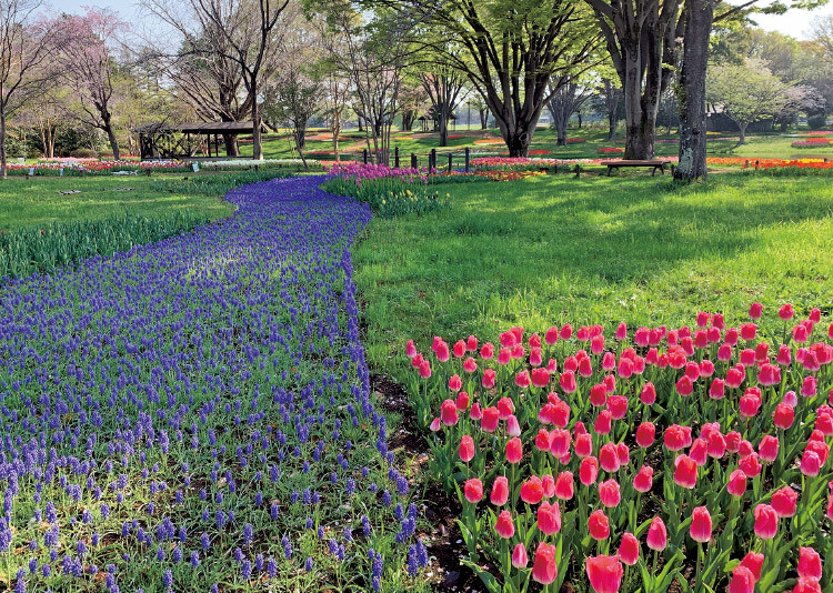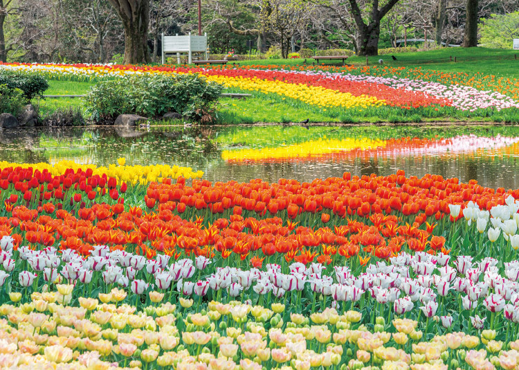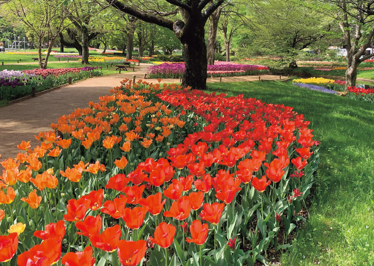 国営昭和記念公園の「渓流広場」につくられるチューリップガーデン。一斉に開花するシーンはダイナミックで見応えがある。