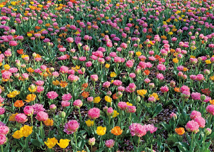 チューリップガーデンは前年の5月にはデザインを決めて品種をセレクトし、球根を発注します。25万球にも及ぶので早く手配しないと確保できなくなってしまうため、スタートが早いのです。 球根の植え付けは、11~12月ごろに行います。膨大な数なので適期に植え終わるか気が急きますが、病気の発生を防ぐために球根を消毒する手間は惜しみません。1㎡当たり55球を目安に10~15㎝間隔で球根3個分くらいの深さに植え付けていきます。「球根植物は植え付けた後は放任しても咲く」というイメージをもたれがちですが、乾燥が続く場合は水やりをすることもあります。水が足りないと花が小さくなり、花茎が伸びずに地面付近で咲いてしまうため、1~3月の降水量は大切です。また、花後は適宜花がらを摘み、常にきれいに見えるよう手入れをします。