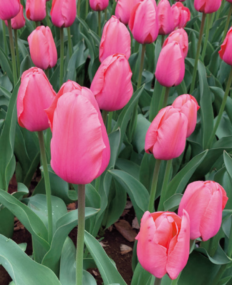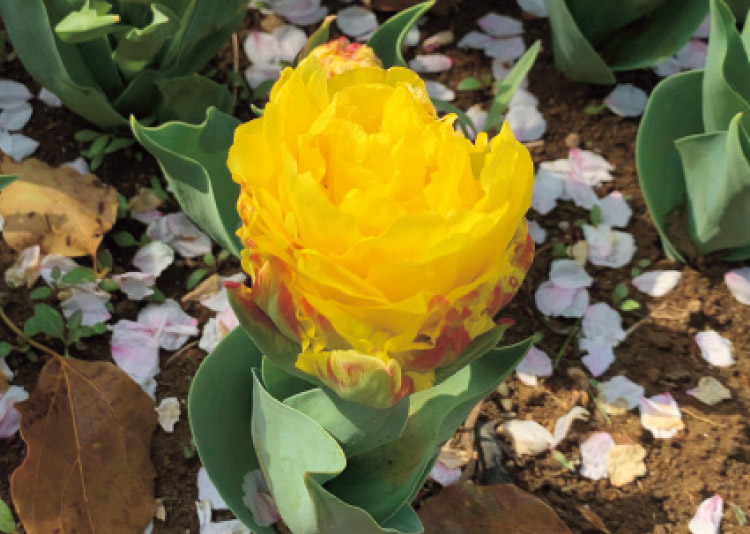 チューリップの植栽で特に注意すべきは、開花期を合わせることです。品種には早生、中生、晩生がありますが、晩生は品種が少ないため、主に早生・中生を選んでいます。早く咲くものと遅く咲くものを組み合わせて同じ場所に植え、長く開花を楽しめるように工夫しながら、早く咲くものは草丈が低いものを、後から咲くものは草丈が高いものを選び、咲きつなぐ時期も見映えがよくなるように植栽しています。